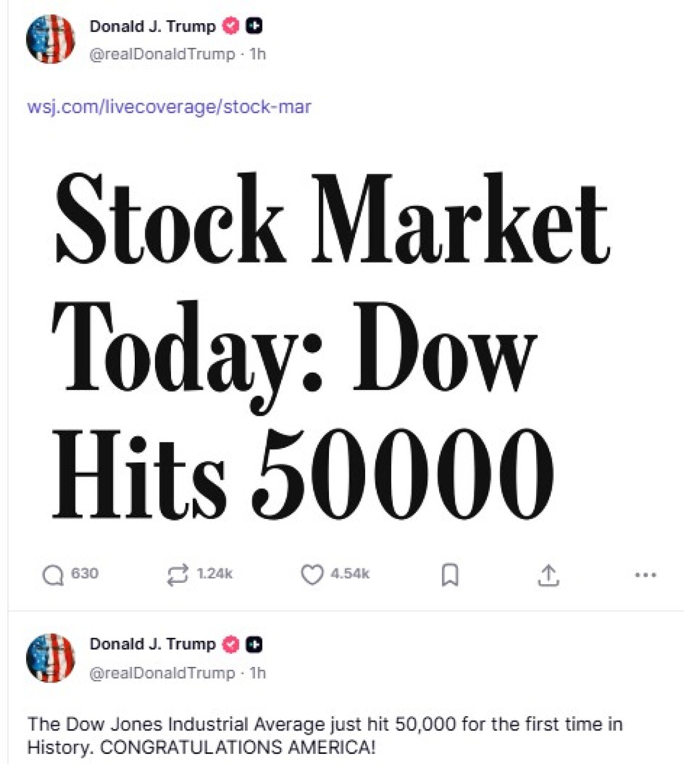 Ο Ντόναλντ Τραμπ έγραψε συγκεκριμένα στο Truthsocial: Ο Δείκτης Dow Jones Industrial Average μόλις έφτασε τις 50.000 μονάδες για πρώτη φορά στην ιστορία. ΣΥΓΧΑΡΗΤΗΡΙΑ ΑΜΕΡΙΚΗ!
